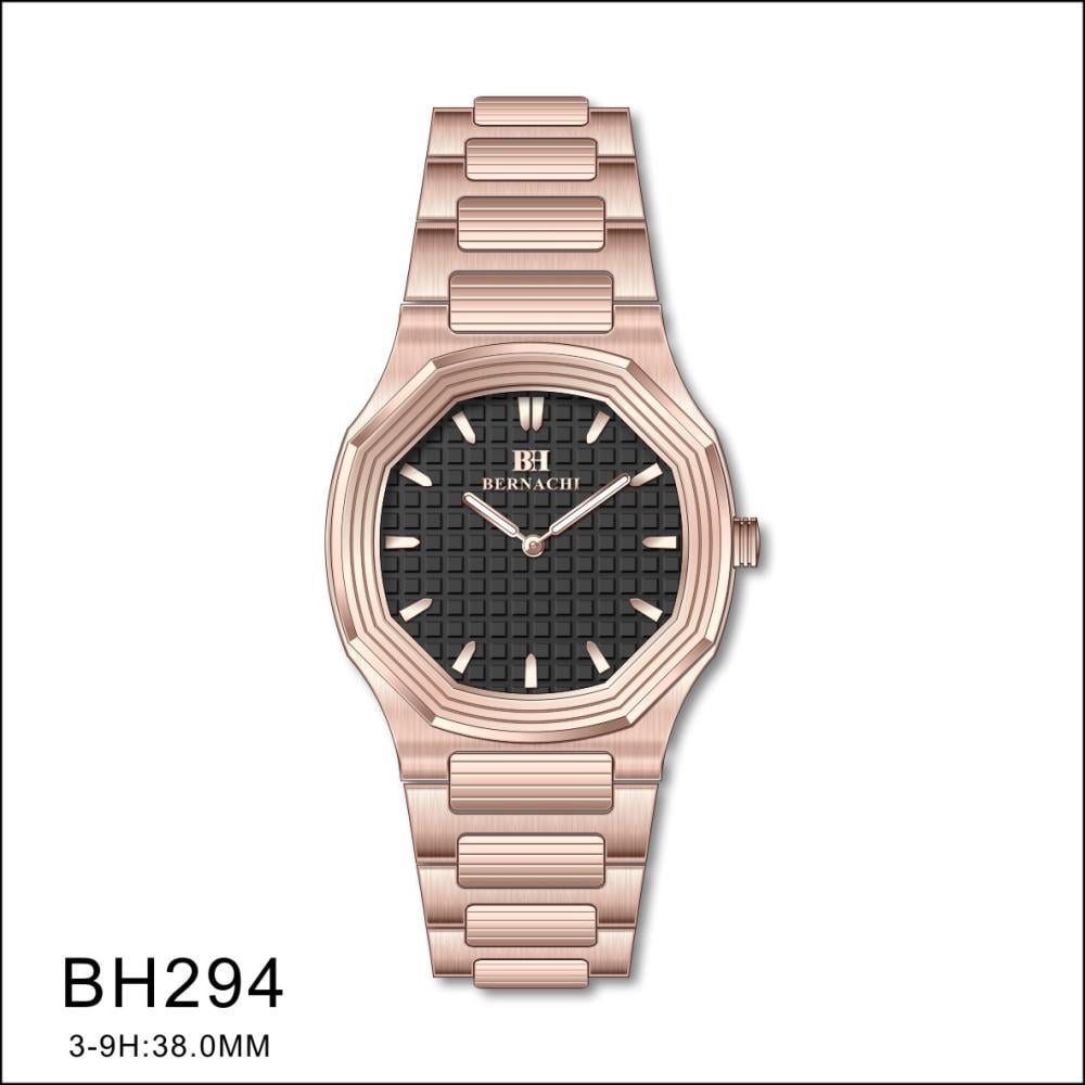 المنتج عبارة عن ساعة يد رجالية أنيقة من ماركة بيرناتشي. تتميز بتصميم عصري وفريد، حيث يأتي وجه الساعة بتفاصيل شبكية دقيقة ومميزة. يحتوي التصميم على علامات مؤشر أنيقة تحيط بالوجه السداسي الأضلاع، مما يمنحها مظهراً فريداً وعصرياً. السوار يتكون من قطع مستطيلة متصلة بتصميم هندسي أنيق. قطر الساعة هو 38.0 ملم. الساعة تحمل رمز الموديل BH294.