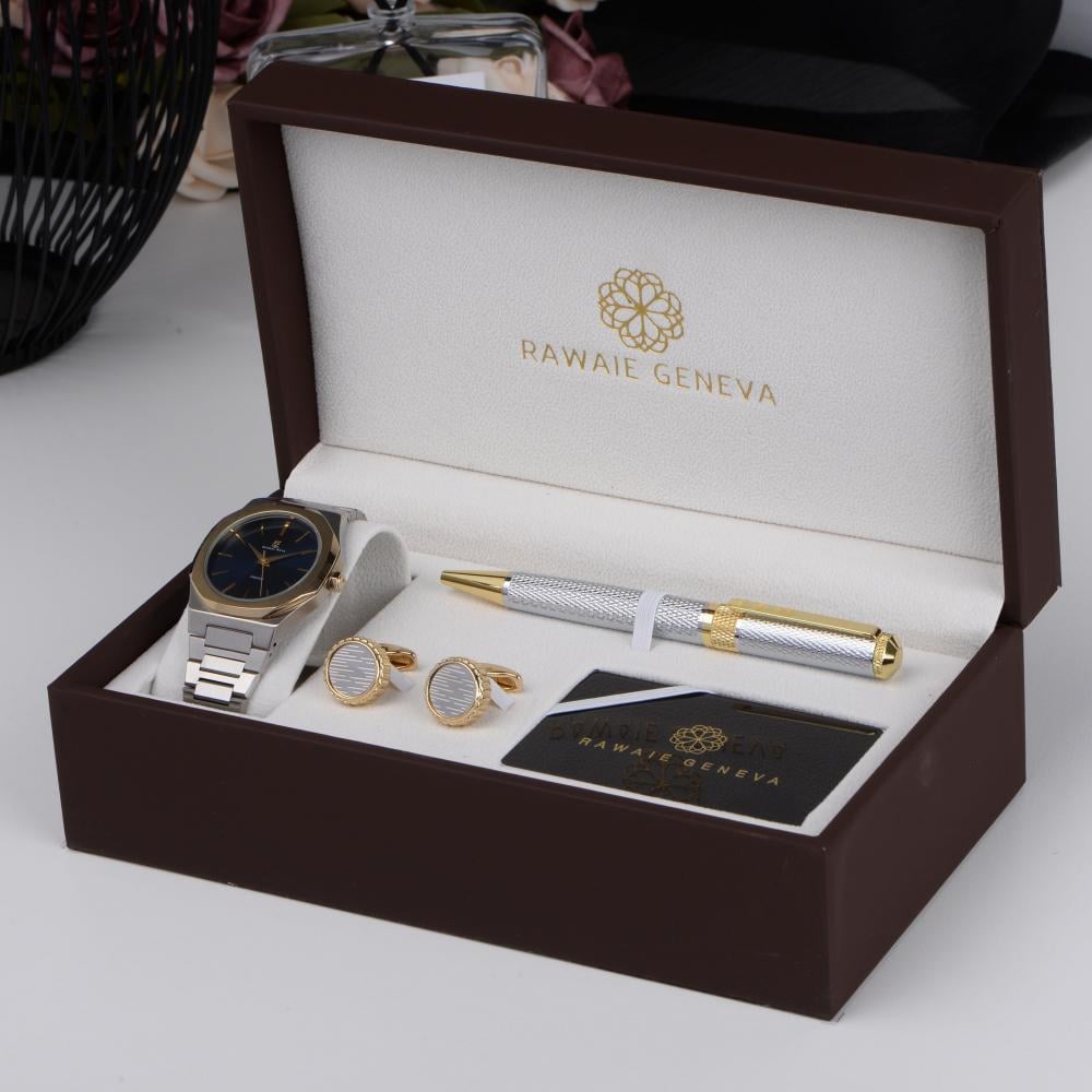 احصل على طقم رجالي فاخر يضم ساعة بتصميم أنيق، كبك بتفاصيل راقية، وقلم معدني فاخر — كلها ضمن علبة واحدة أنيقة تناسب الإهداء وتكمل أناقتك.