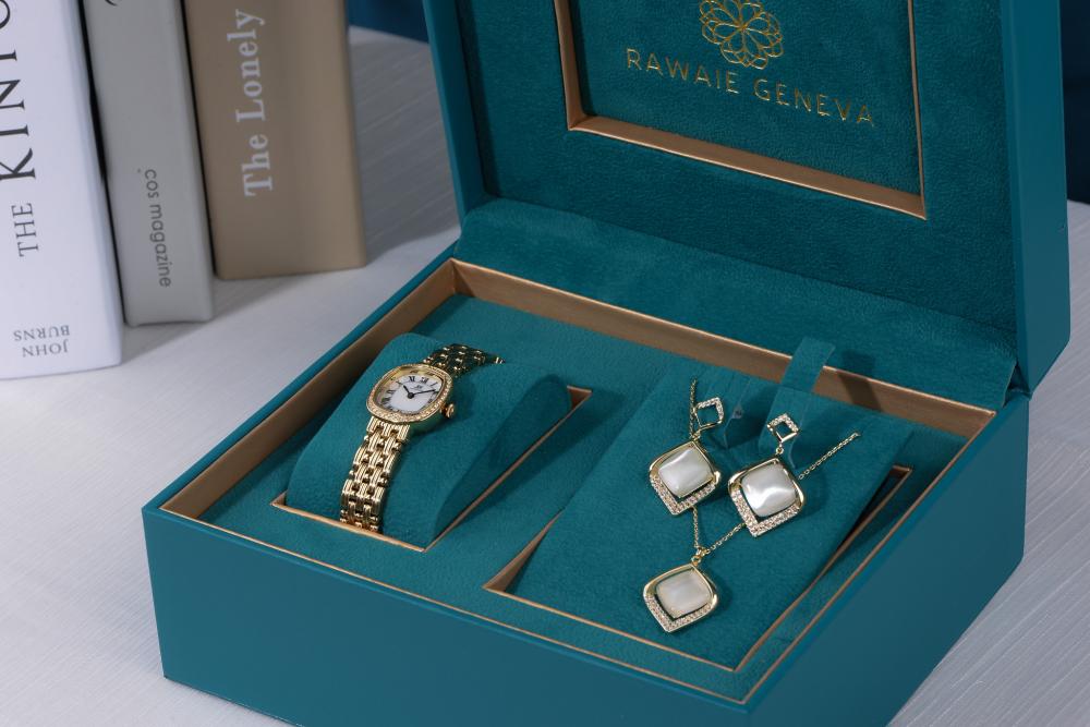 يقدم لك متجر روائع جنيفا تشكيله واسعه من الاطقم النسائيه المميزه ذات الجوده العاليه .. طقم من ساعة+حلق +سلسال تناسب جميع مناسباتك